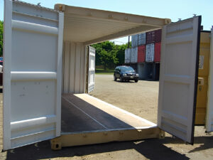 20’ x8’x8’6” shipping container, painted RAL 6007 outside and RAL 7016 inside. Doors moved to the side to allow side loading. Dry, watertight and lockable. Ideal factory, farm, etc, where end loading is not ideal.